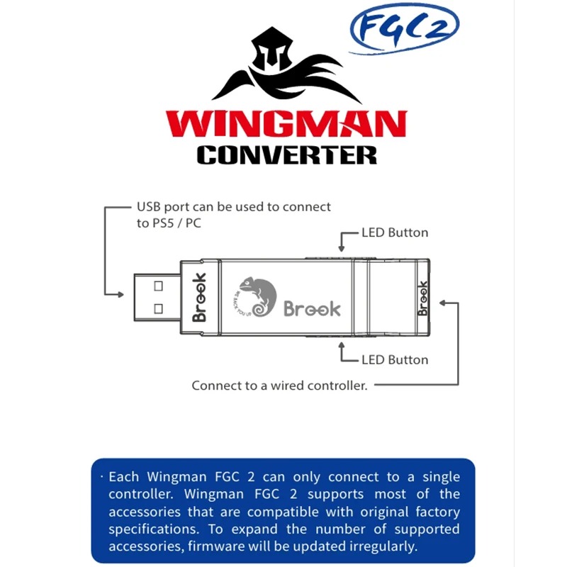 -Each Wingman FGC 2 can only be connected to one controller.Wingman FGC 2 supports most accessories compatible with original factory specifications.In order to expand the number of supported accessories, the firmware will be updated irregularly.